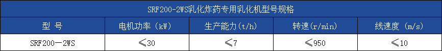 SRF200-2WS型乳化炸药专用乳化机用于民爆行业的乳化炸药生产线,已通过国家认定机构的相关安评,其技术指标符合国家相关标准,生产的炸药指标均达到国家GB18096—2000标准。该机设计结构新颖、合理,乳化效率高、产能大、能耗低。